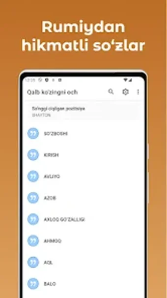 Qalb Kozingni Och - Rumiy là một ứng dụng miễn phí cho Android, thuộc thể loại 'Sách'.Về Qalb Kozingni Och - Rumiy cho Android